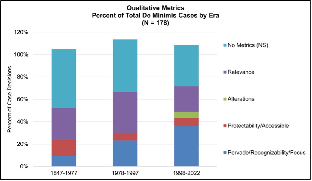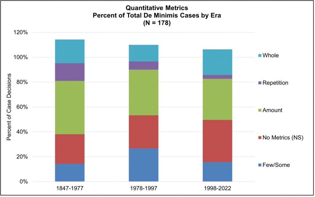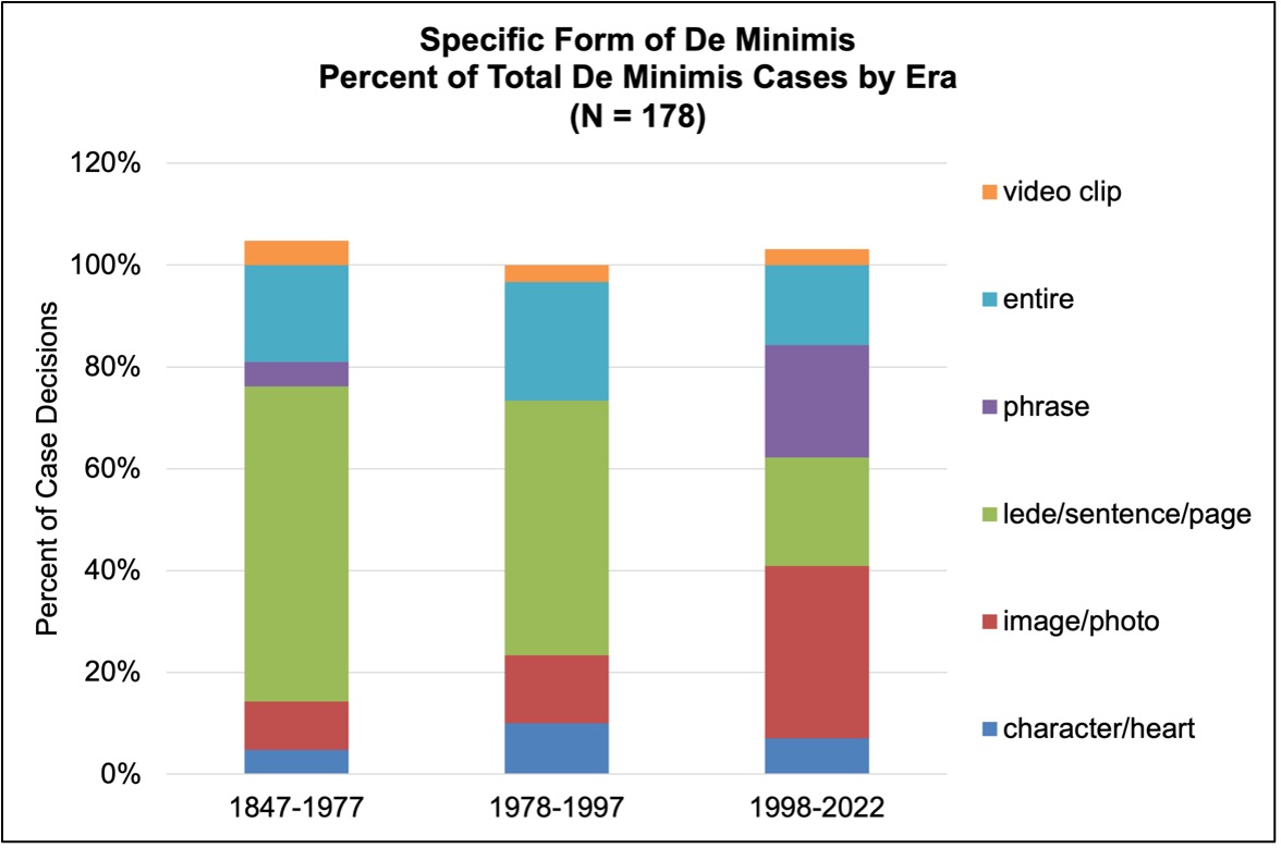 The Article proceeds as follows. Part I discusses the early history of the de minimis doctrine and its 19th century origins in equity, situating its essential role outside the statutory framework to maximize judicial resources and shortcut wasteful lawsuits. Part II puts this history in context of three eras of de minimis cases, “the Early Era,” the “Transition Era,” and the “Contemporary Era.” It explains the various characteristics of the cases from each of these eras and describes several exemplary cases to illuminate each time period. In doing so it highlights patterns that eventually resolve into a de minimis defense that is clearer and more efficacious. Part III describes the de minimis data set as a whole, the method for collecting and analyzing the cases, and notable trends among the three eras, further explaining the patterns in Part II. The analysis in Part III specifically connects the themes of the “Eras Tour” in Part II with a quantitative analysis of the data, including focus on the characteristics of the cases.29 Surprising features of more recent de minimis cases emerge from this analysis, some are detrimental to judicial efficiency and others support it. Detrimental features include a wider variety of de minimis standards that complicate the terrain. Also, some standards improperly confound de minimis with substantial similarity, thwarting early dismissal and rendering the defense ineffective. Beneficial features include reviving the “technical use” standard for the de minimis defense (a non-actionable copying of a whole work), which is a historical anchor of the defense. Another beneficial trend is courts’ frequent countenance of defendant’s copying whole pictorial works in the internet age when images are more essential than ever to communication.
