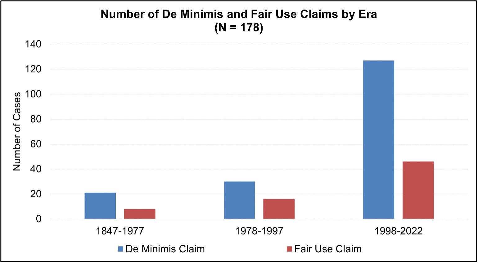 After the 1976 Act, defendants raise the de minimis defense with more frequency. Notably, fair use was codified in the 1976 Act, but the de minimis defense was not. Nonetheless, the variety and quantity of cases alleging de minimis copying as a defense to infringement rose substantially after 1978 to 157 cases, affirming its common law roots and its significance to court cases.83 Several features of a changing society fuel this upward trend of de minimis cases. First, unauthorized copying becomes ubiquitous with copying technology commercialized and accessible (think photocopy machines, home recording technology, and the rise of personal computers).84 Second, the entertainment industry’s licensing and distribution systems become sophisticated and complex, and freelance and independent authors are asserting copyright claims.85 Third, mid-20th century infringement standards evolve, including the doctrines of fragmented literal similarity and substantial similarity, allowing for reproduction infringement based on much smaller parts of the whole work.86 These technological and industry changes, combined with infringement doctrines evolving to become notoriously complex and quixotic,87 create the need for a more robust de minimis defense, which is asserted with more frequency in the Third Era.
