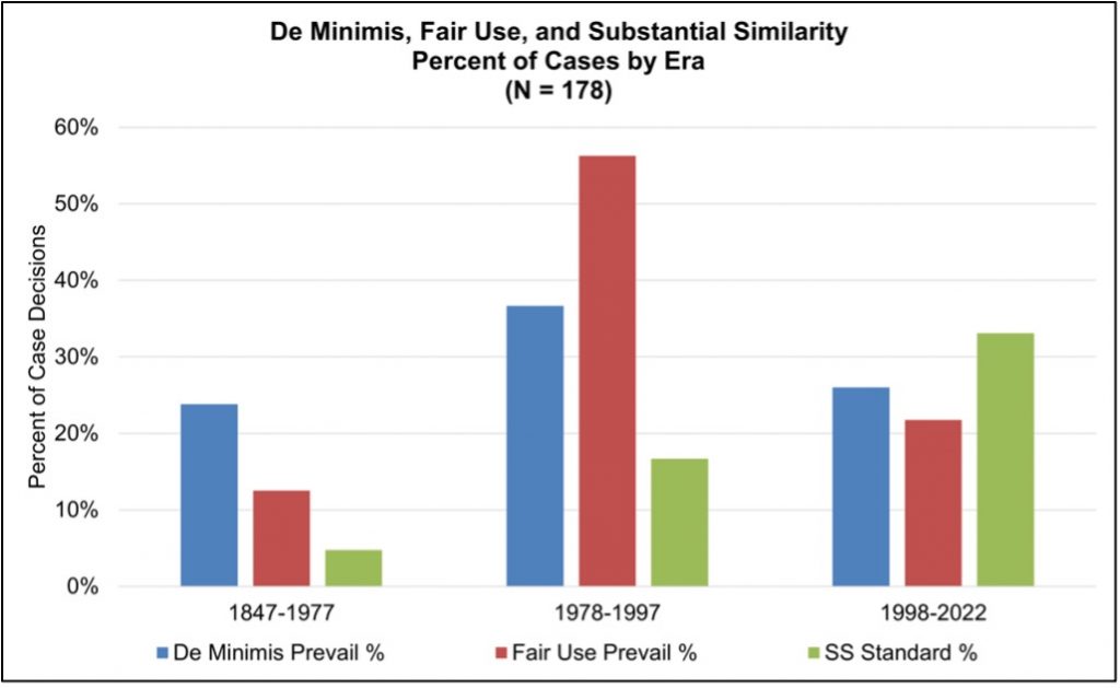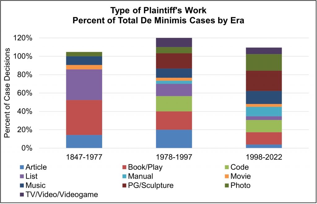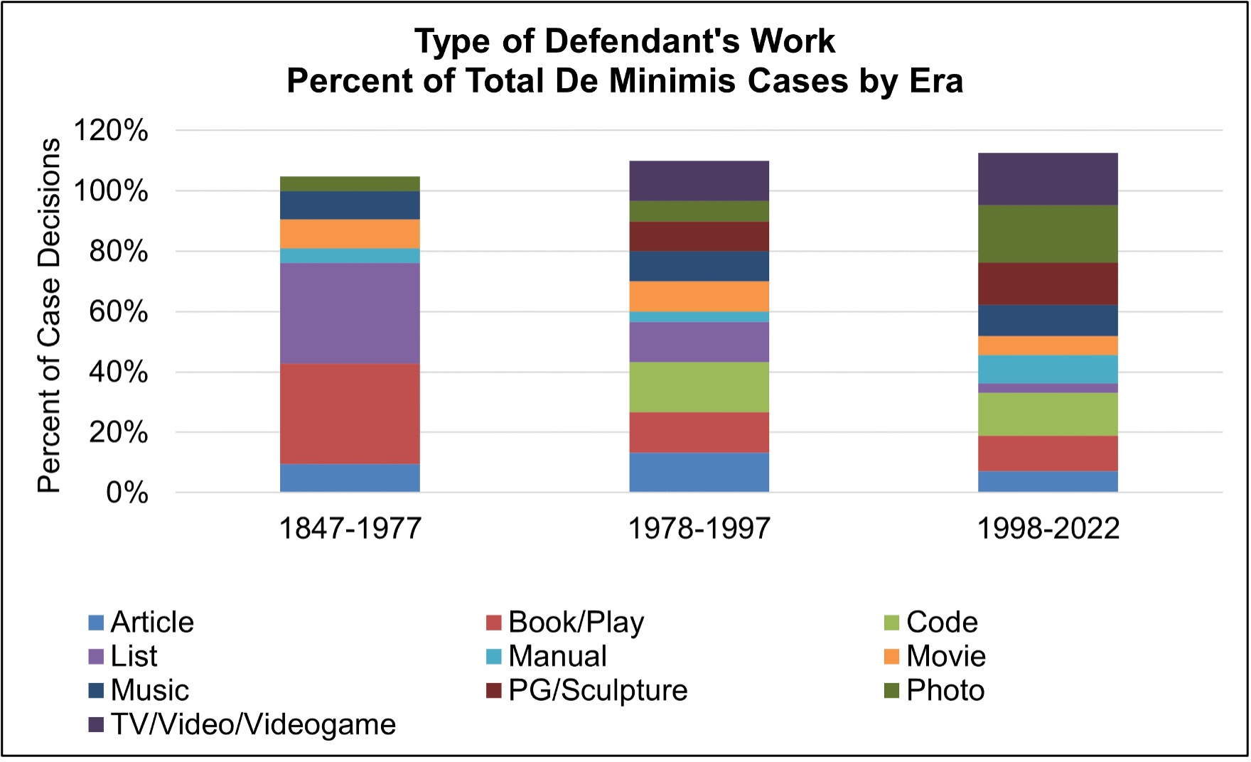There are 127 cases in this era, which as a percent of all copyright decisions is more than double the previous eras.168 It might make sense, then, that legal standards would be more diverse as courts struggle to assess de minimis defenses across a wide range of claims and industries.169 Although the de minimis defense is more common in the Contemporary Era, it prevails less frequently as compared to the Transition Era.170