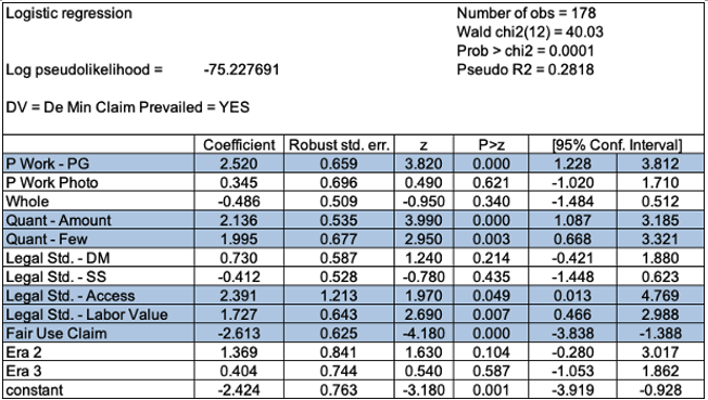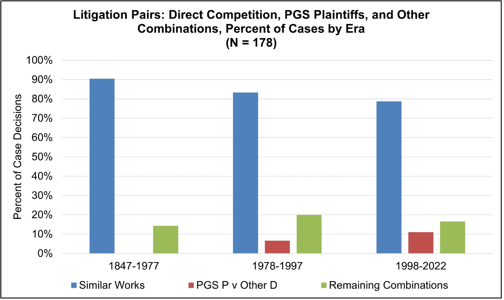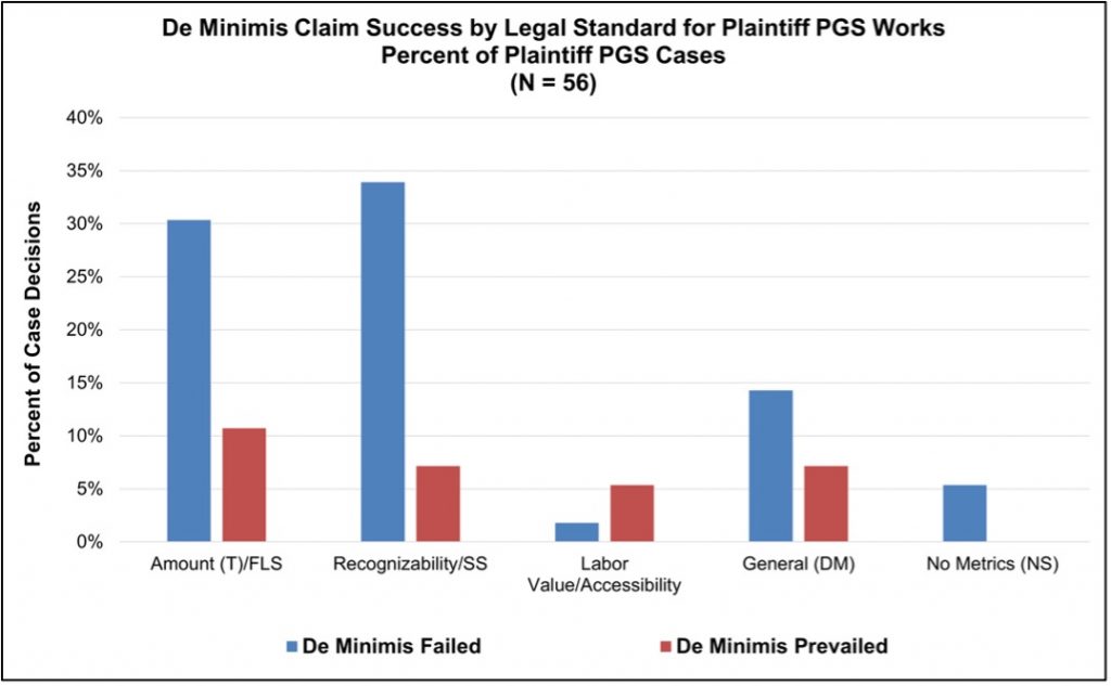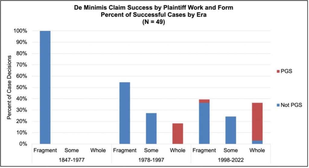 322. These may not be all the factors relevant to a prevailing de minimis challenge. Unobservable and difficult to measure factors may be unaddressed confounders. For example, one factor that could influence a de minimis win might be “star power” or the number of eyes that may have seen the accused violation. As copying becomes more ubiquitous and it’s easier to see a potential violation, the courts may see that as “non-trivial.” This is a difficult factor to measure consistently over almost 200 years for very different types of works. However, this factor is likely uncorrelated with the work being a PGS work, so our main results would likely hold even with this factor included.