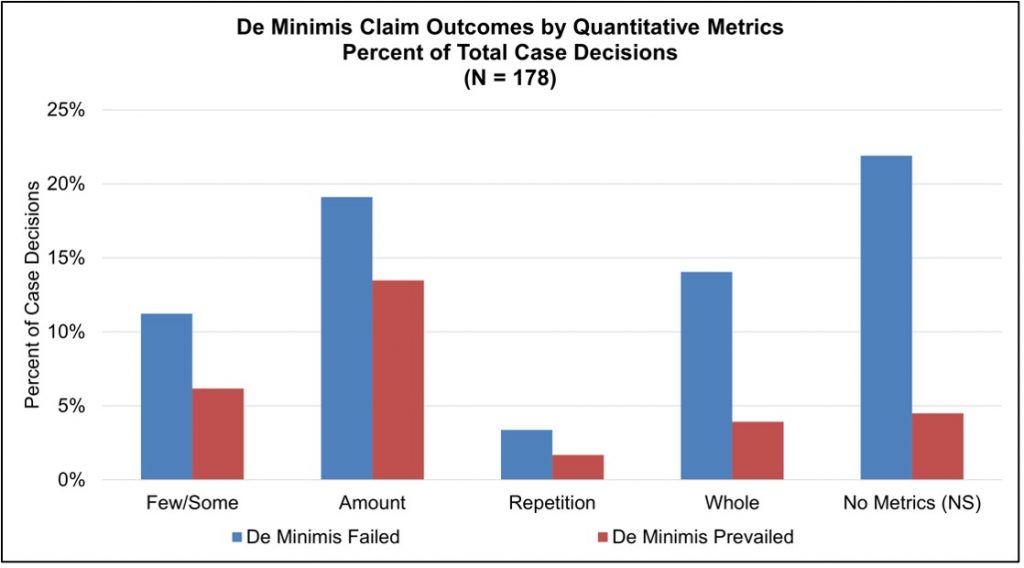 312. When courts evoke a quantitative metric or a perfunctory de minimis standard, defendants nearly always prevail (91% of the time, or 45/49 prevailing defendant cases). See infra Figures 16 and 19 and accompanying notes.