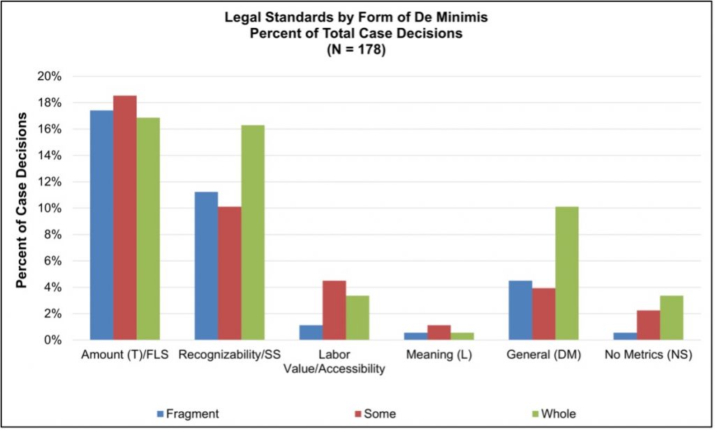 There are only four scholarly analyses of the copyright de minimis doctrine, but none are empirical.26 A few court cases from the past two decades discuss the copyright de minimis defense in detail and have become doctrinal benchmarks for its initial assessment.27 The facts of those cases range widely, from a fleeting glimpse of a whole copyrighted pictorial work in the background of a film to the use of a musical fragment from one musical work in another.28 But whether they reflect long-standing past practice or a change is unclear without the bigger picture. This Article will for the first time combine doctrinal, historical, and empirical perspectives on the copyright de minimis defense to put these more recent cases in perspective.