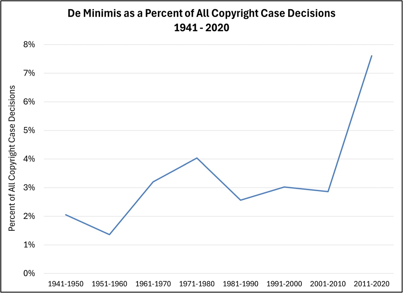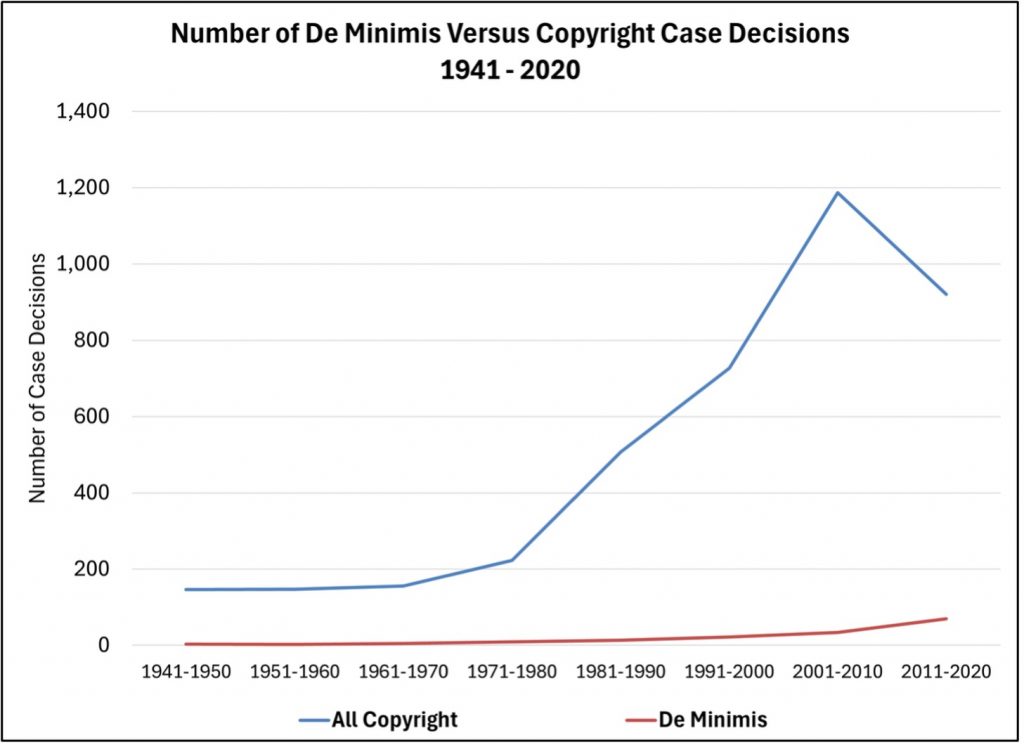 The copyright de minimis doctrine has a long history that has shapeshifted over time.16 In the internet age, the copyright de minimis defense has increased in relevance as copyright lawsuits (and IP generally) are more mainstream and infringement liability more widespread.17 The digital age has made the copyright de minimis defense more relevant than ever. As artificial intelligence trained on copyrighted works has begun to dominate all areas of technology and society, whether those AI systems are making de minimis copies or causing substantial copyright harms is a question that could make or break the technology.18 In everyday life, we copy whole photographs and articles to send to friends and colleagues via email, text, and social media as essential forms of communication and discussion. When engaging in research, making our own art, and writing about the world around us, we inevitably copy bits of other copyrighted work; sometimes we copy the whole work and put it to productive and non-harmful uses. All these ubiquitous and quotidian activities implicate the copyright de minimis defense. This Article examines the patterns in assertions and analyses of the copyright de minimis defense over the past century and specifically in our digital era when copying is omnipresent but its triviality widely disputed. The Article’s aim is three-fold: (1) to map the de minimis defense as a way to learn more about it doctrinally—when is copying too much?; (2) to clarify the standard for the de minimis defense to better achieve its goal of judicial economy; and in doing so (3) to address the deeper questions about the harm copyright law aims to prevent in order to facilitate (and not chill) more communication and authorship in the digital age.19