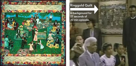 Ringgold is a dispute about the unauthorized display of a “story quilt” (in poster form) as background set decoration for a television show.187 (See Image 1.) The poster of the quilt was displayed intermittently during the half-hour sitcom for a total of 27 seconds.188 The court nonetheless held that that use of the poster was not de minimis and violated Faith Ringgold’s copyright in the quilt. The court also rejected fair use as a defense.189